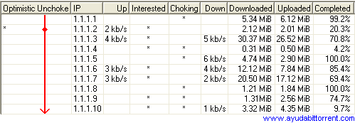 Hay que tener en cuenta que el Optimistic Unchoke se realiza con los usuarios que estén conectados excepto a los que ya se les está subiendo algo (no vamos a subir dos veces al mismo usuario) y que estén Interested (interesados) en las pieces que se disponen. Los seeds con el 100% del archivo no están interesados o, el que está a punto de terminar una descarga (como vemos el usuario de la ip 1.1.1.1 en la imagen superior que ya dispone de todas nuestras pieces).